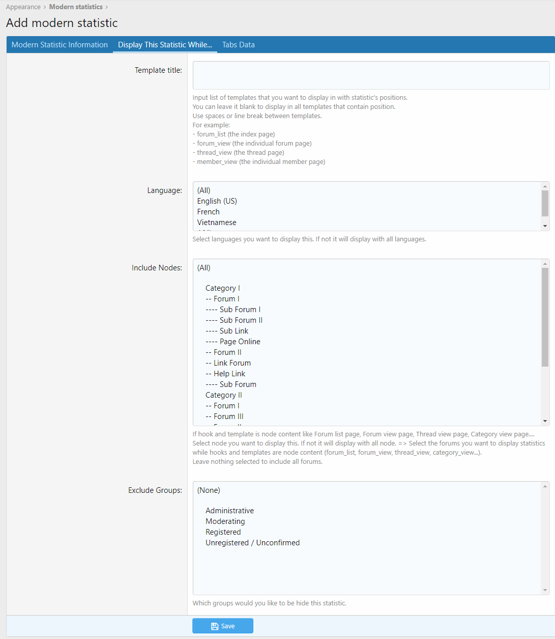 Существуют четыре основных объекта статистики: пользователи, темы, профили и ресурсы. Пользователи могут видеть большое количество статистических данных об этих объектах, таких как «Последние ответы», «Важные темы», «Лучшие ресурсы», «Самые загружаемые ресурсы», «Больше всего сообщений у пользователей», «Последние сообщения профиля» ... Это помогает пользователям поддерживать любые активные дискуссии и предлагать полезную информацию другим пользователям ,