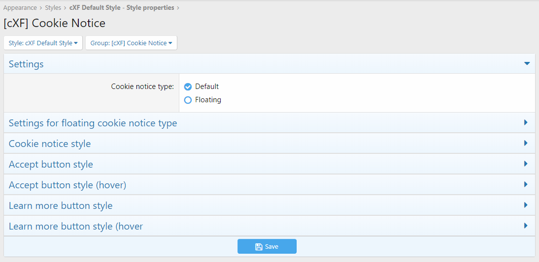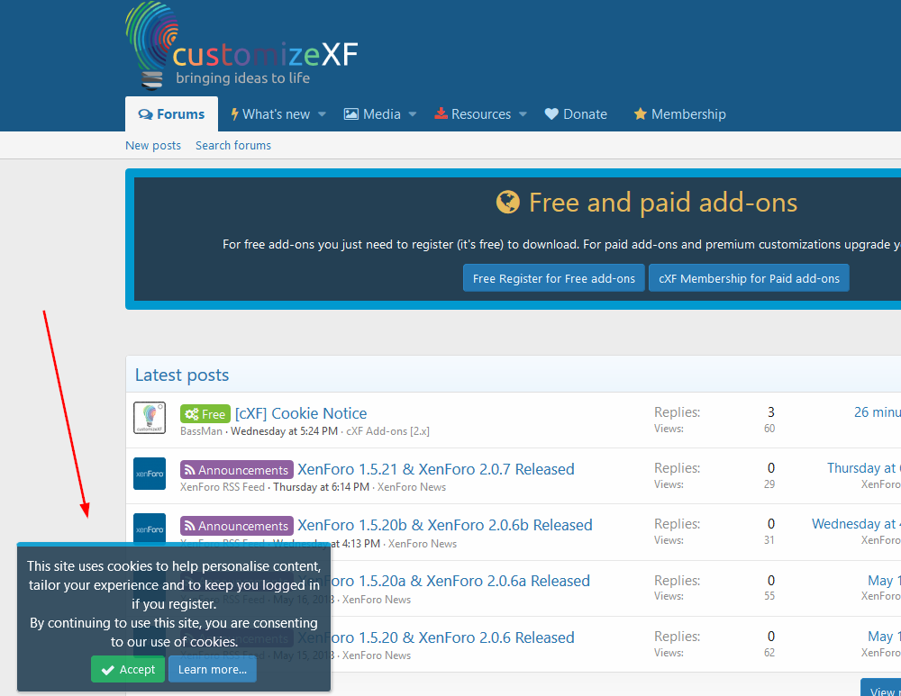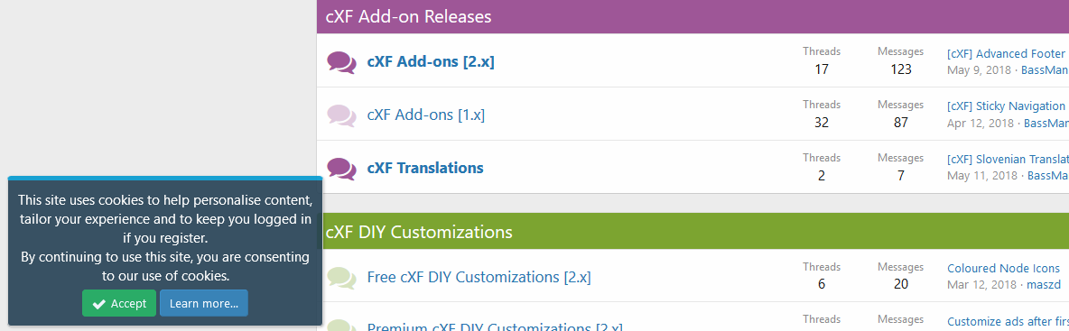 Настройте уведомление о файлах cookie XenForo по умолчанию или сделайте его плавающим. Это работает также с расширенным уведомлением о согласии на использование файлов cookie (от XenForo 2.2.12).