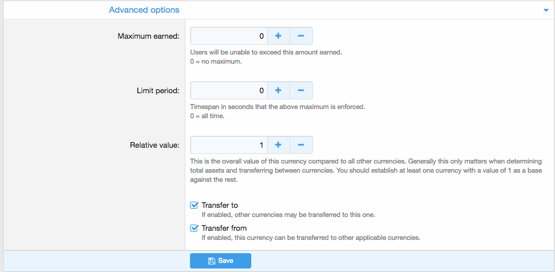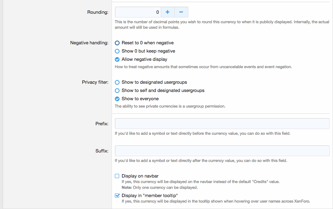 - Выберите видимость валюты (показать назначенным группам пользователей, показать самим себе и назначенным группам пользователей или показать всем)