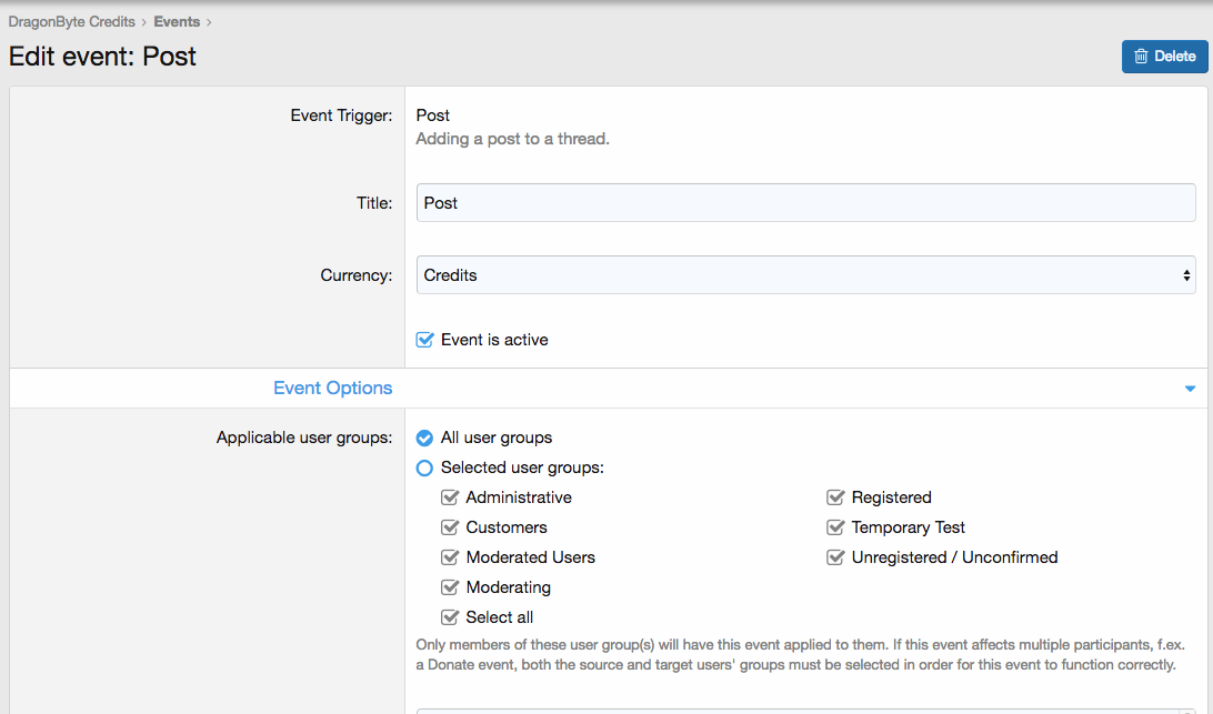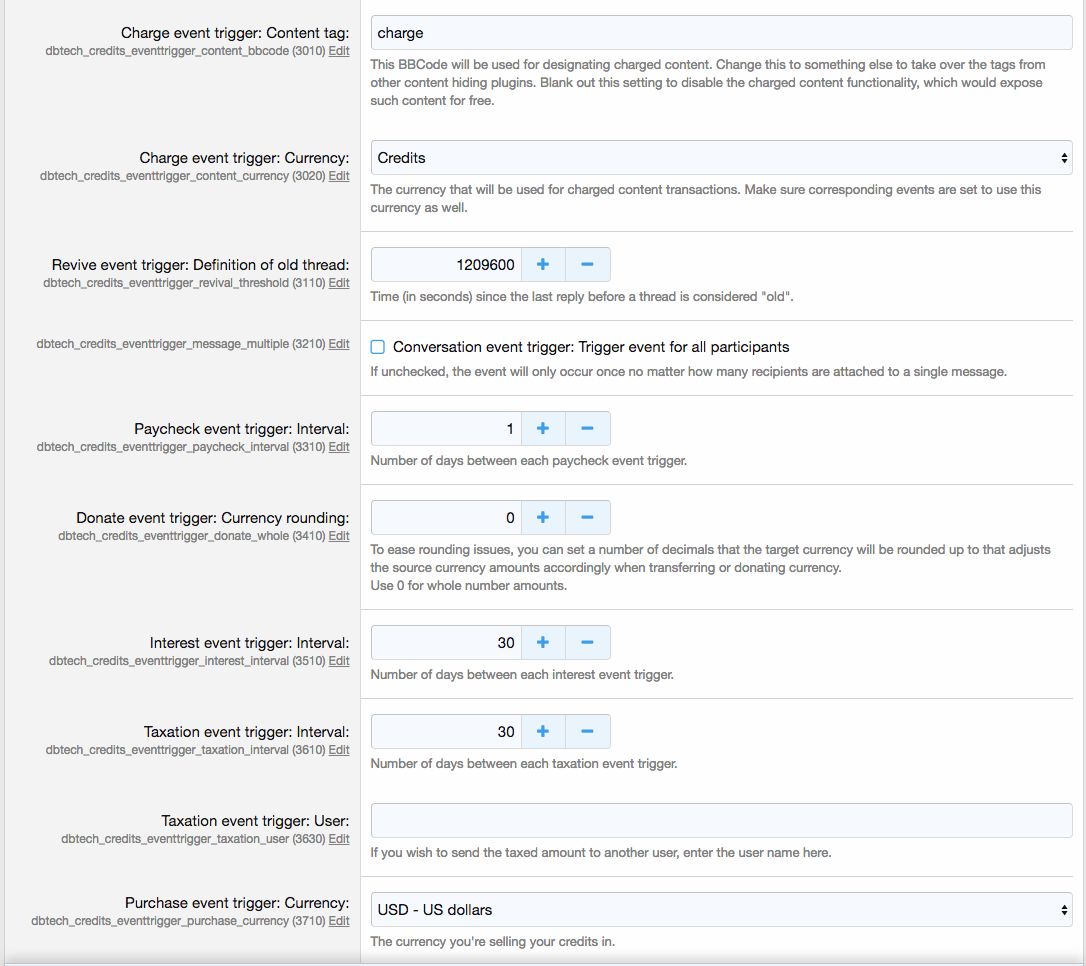 DragonByte Credits позволяет создавать мощные "События", которые могут происходить на вашем форуме. Благодаря расширенным функциям, таким как начисление, случайные добавления и налогообложение, вы можете создавать действительно интересные комбинации событий, которые позволяют вам беспрецедентно контролировать свои кредиты.