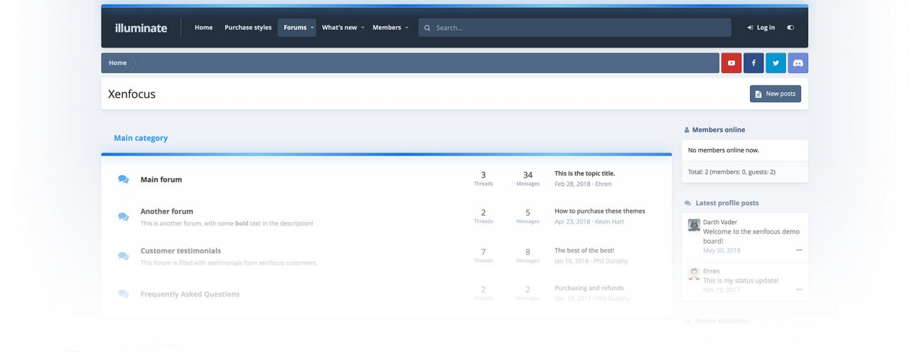illuminate - это минималистичная, современная тема для xenforo 2. Компактный темный заголовок аккуратно содержит ваш логотип, навигацию, плавную панель поиска и пользовательские значки, в то время как основной контент размещен на простом фоне для удобства чтения. Категории могут быть оформлены в собственной уникальной цветовой гамме, которая особенно подходит для спортивных команд, брендов, игр или фильмов.