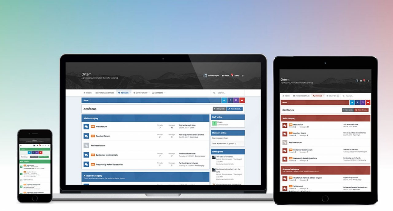 Ortem - минималистичный дизайн, основанный на простом средстве выбора цвета, позволяющем вашим участникам легко настраивать цвета макета, выбирая из набора предустановок. Область заголовка достаточно велика, чтобы вместить большие логотипы и баннеры во всю ширину, а панель навигации расположена в верхней части экрана для удобства доступа.